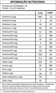 hialurônico, silício orgânico, biotina, complexo B completo, vitaminas A, C, D, E, selênio, ferro e
