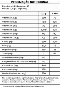 - Condroitina (340mg) e MSM/Metilsulfonilmetano (260mg) — compostos encontrados nacartilagem